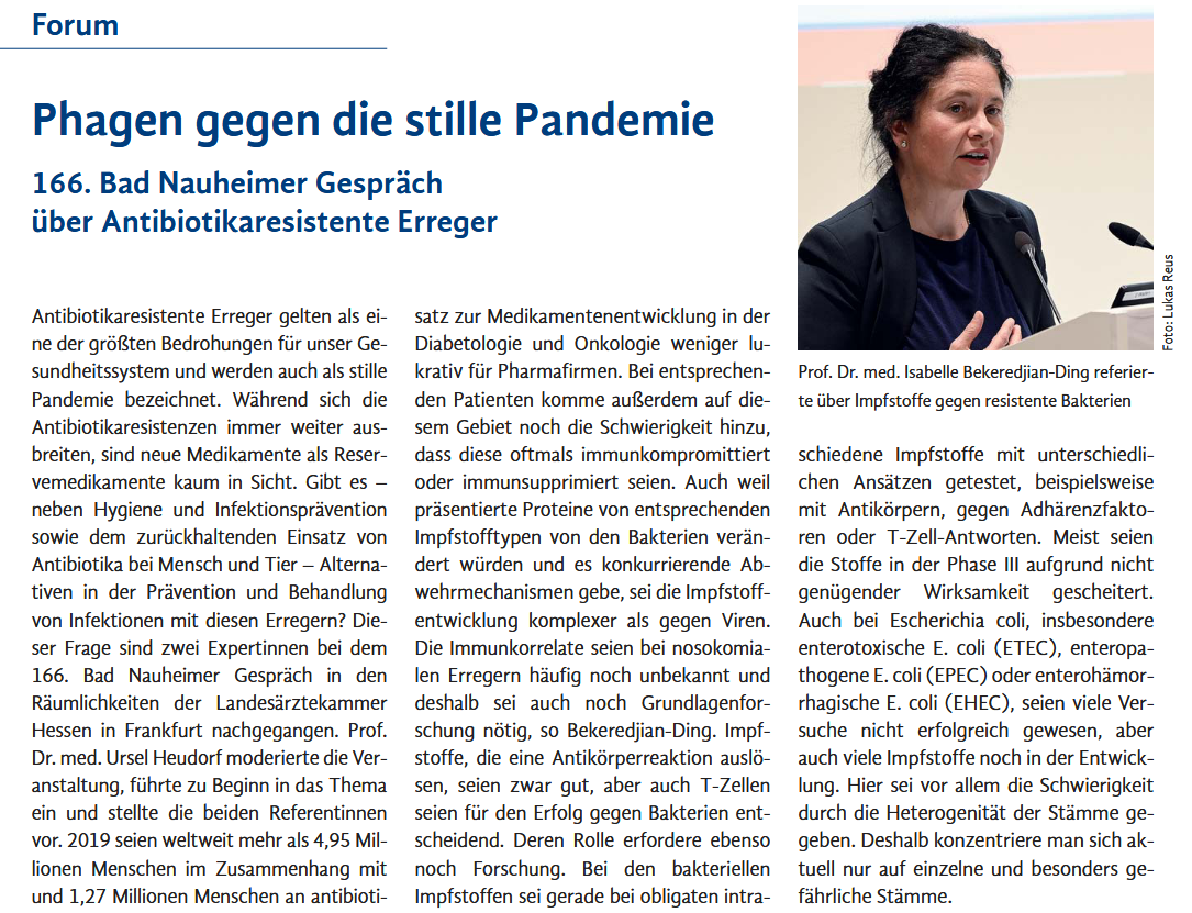 Impfungen gegen bakterielle und virale Erreger sind eine Erfolgsgeschichte in der Medizin. Bereits seit Jahrzehnten wird auch an Impfstoffen gegen antibiotikaresistente Erreger geforscht. Frau Prof. Dr. Isabelle Bekeredjian-Ding, Universität Marburg, wird den aktuellen Sachstand der Impfstoffentwicklung gegen antibiotikaresistente Erreger darstellen.
