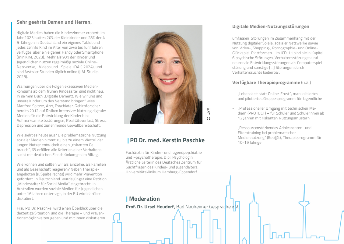 Wie können und sollten wir als Einzelne, als Familien und als Gesellschaft reagieren? Neben Therapie-angeboten (s. Spalte rechts) wird mehr Prävention gefordert. In Deutschland wurde jüngst eine Petition „Mindestalter für Social Media“ eingebracht, in Australien wurden soziale Medien für Jugendlichen unter 16 Jahren untersagt, in der EU wird darüber diskutiert.